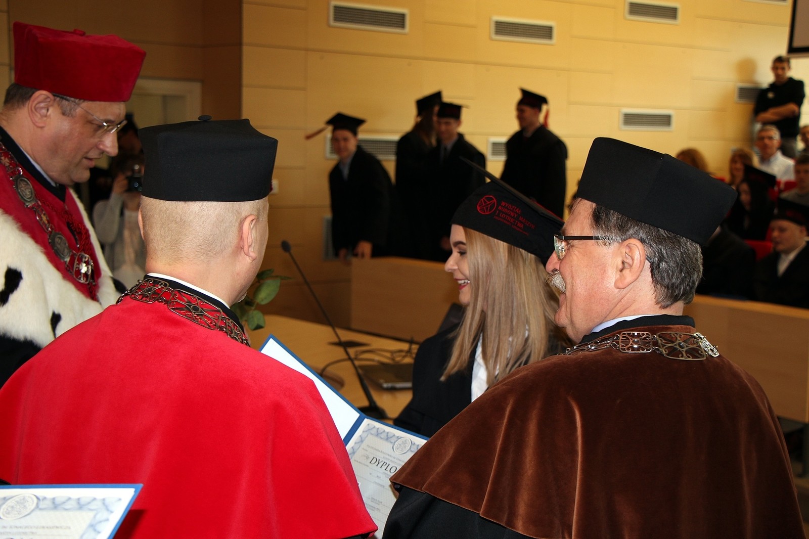 Dyplomy absolwentom uroczyście wręczyli: dr hab. inż. Grzegorz Masłowski, prof. PRz, prorektor ds. kształcenia, prof. dr hab. inż. Jarosław Sęp, dziekan WBMiL oraz dr hab. inż. Aleksander Mazurkow, prof. PRz, dziekan WMT.