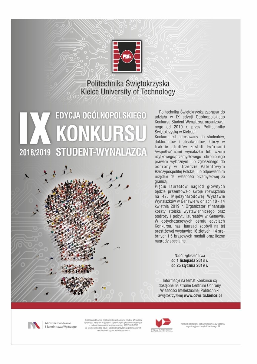 Więcej informacji na temat konkursu można uzyskać w Centrum Ochrony Własności Intelektualnej Politechniki Świętokrzyskiej www.cowi.tu.kielce.pl.