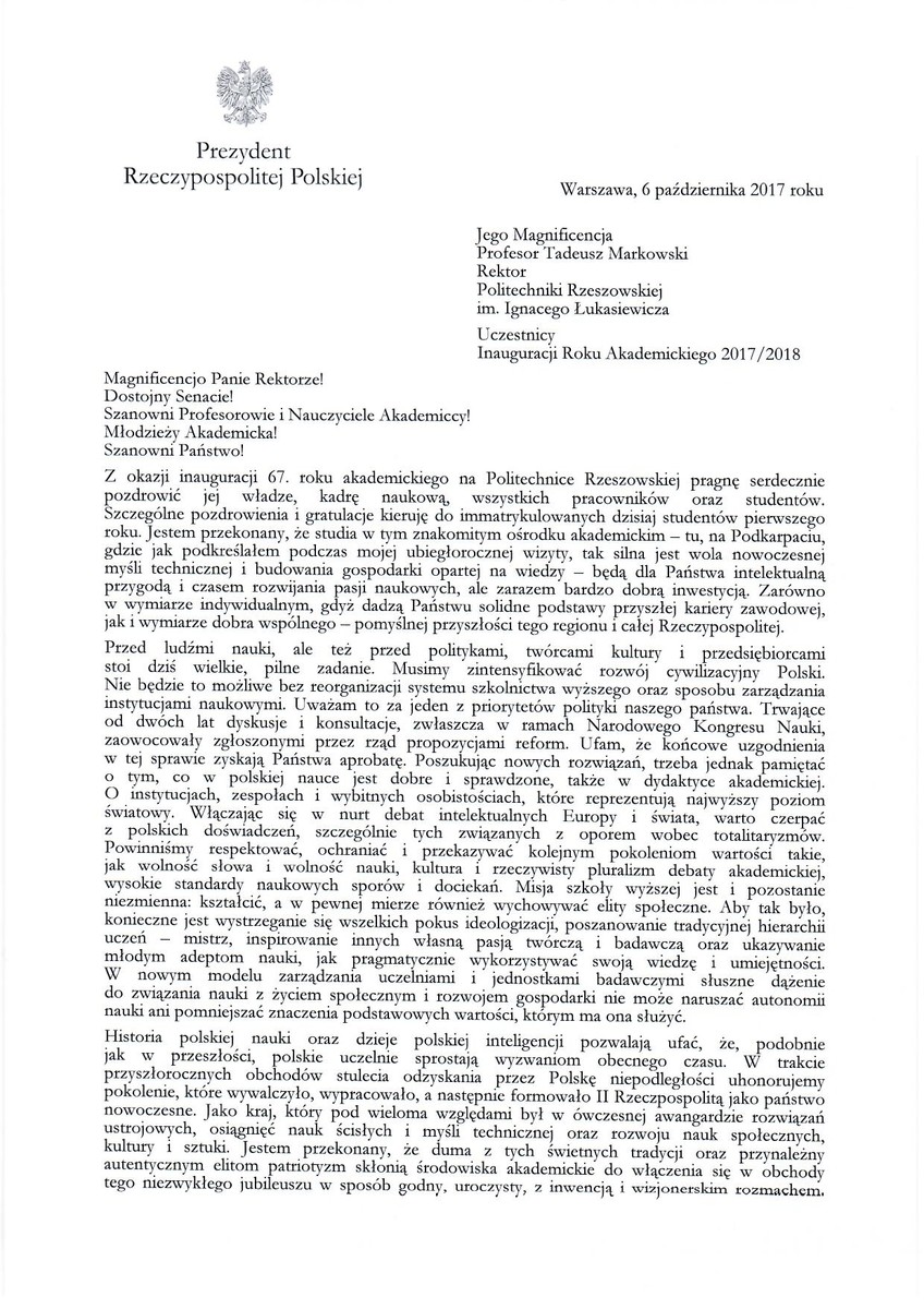 List z okazji nowego akademickiego, na ręce prof. dr. hab. inż. Tadeusza Markowskiego, rektora Politechniki Rzeszowskiej przesłał prezydent RP Andrzej Duda. - Niech będzie to pomyślny czas dla Polski, dla Państwa uczelni oraz dla każdego z Państwa. Niech przyniesie wiele osiągnięć i satysfakcji na polu nauki, a w życiu osobistym niech będzie okazją do budowania wartościowych relacji międzyludzkich i podejmowania dobrych decyzji - napisał prezydent.