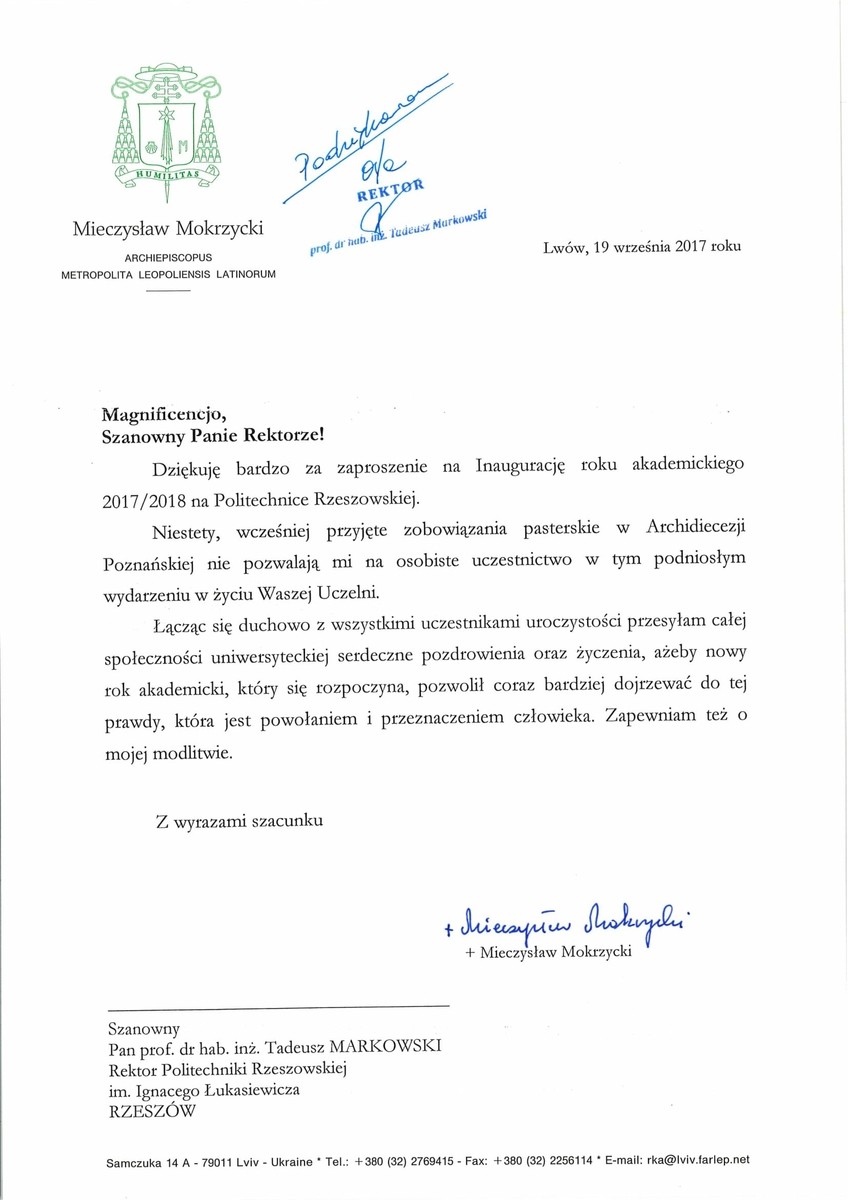 Ponad 30 listów gratulacyjnych z życzeniami sukcesów i dalszego rozwoju otrzymała Politechnika Rzeszowska z okazji rozpoczęcia nowego roku akademickiego. Ich autorami są przedstawiciele najwyższych władz państwowych, parlamentarzyści, duchowni i samorządowcy. Listy gratulacyjne dotarły także z różnych ośrodków naukowych z całej Polski.