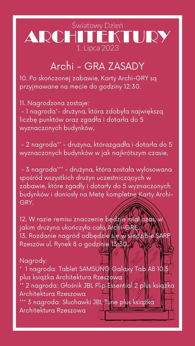 Zwycięskie trzy drużyny „Archi-GRY” otrzymają nagrody rzeczowe o łącznej wartości 2000,00 zł, których głównym sponsorem jest Politechnika Rzeszowska: 1. nagroda – tablet SAMSUNK Galaxy Tab A8 10.5 plus książka „Architektura Rzeszowa", 2. Nagroda – głośnik JBL Flip Essential 2 oraz książka „Architektura Rzeszowa”, 3. nagroda – słuchawki JBL Tune oraz książka „Architektura Rzeszowa”.
