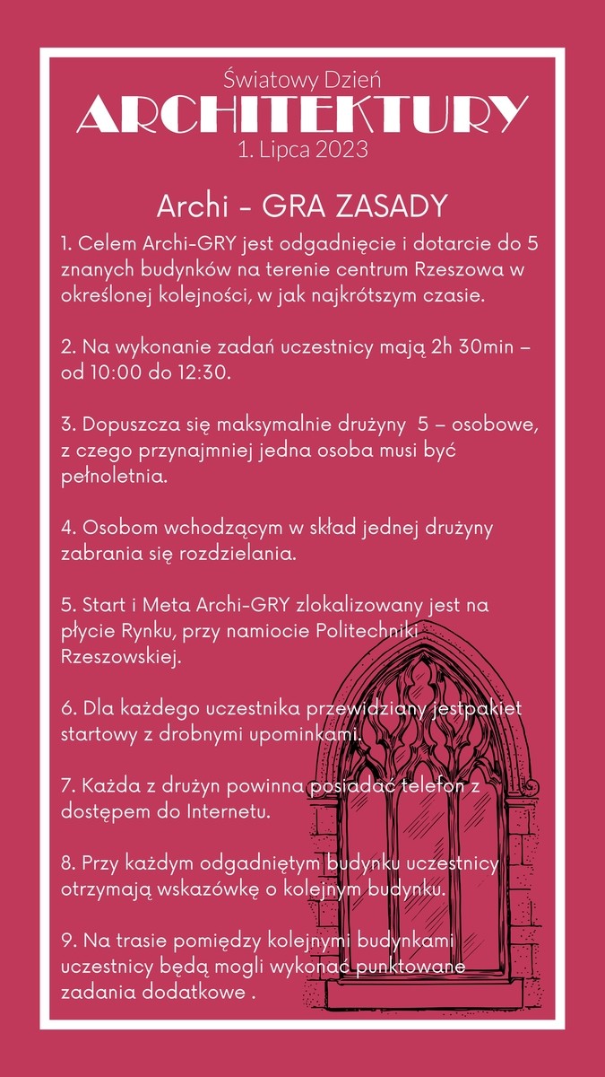 Studenckie Koło Naukowe Architektury Miejsc Społecznych specjalnie na to wydarzenie przygotowało dla wszystkich zainteresowanych kreatywną grę miejską pt. „Archi-GRA”. Gra jest idealną okazją do spędzenia aktywnego czasu z rodziną i przyjaciółmi. Niezależnie od wieku czy doświadczenia każdy może wziąć w niej udział i znaleźć coś interesującego dla siebie. Podczas gry uczestnicy będą mogli poszerzyć swoją wiedzę o architekturze, zgłębić historię miasta oraz rozwijać zdolności dedukcyjne i logiczne przez odkrywanie ukrytych skarbów miasta, rozwiązywanie zagadek związanych z architekturą i odkrywanie sekretów miejsc.
