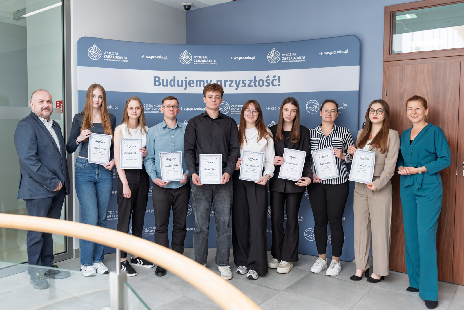 W trakcie uroczystego podsumowania XIII edycji Konkursu Wiedzy Finansowo-Bankowej finalistki i finaliści otrzymali z rąk dziekan Wydziału Zarządzania dr hab. Beaty Zatwarnickiej-Madury, prof. PRz dyplomy i nagrody rzeczowe ufundowane przez prorektora ds. kształcenia dr hab. Iwonę Włoch, prof. PRz, prorektora ds. studenckich i umiędzynarodowienia dr. hab. inż. Bartosza Millera, prof. PRz oraz partnerów Konkursu.